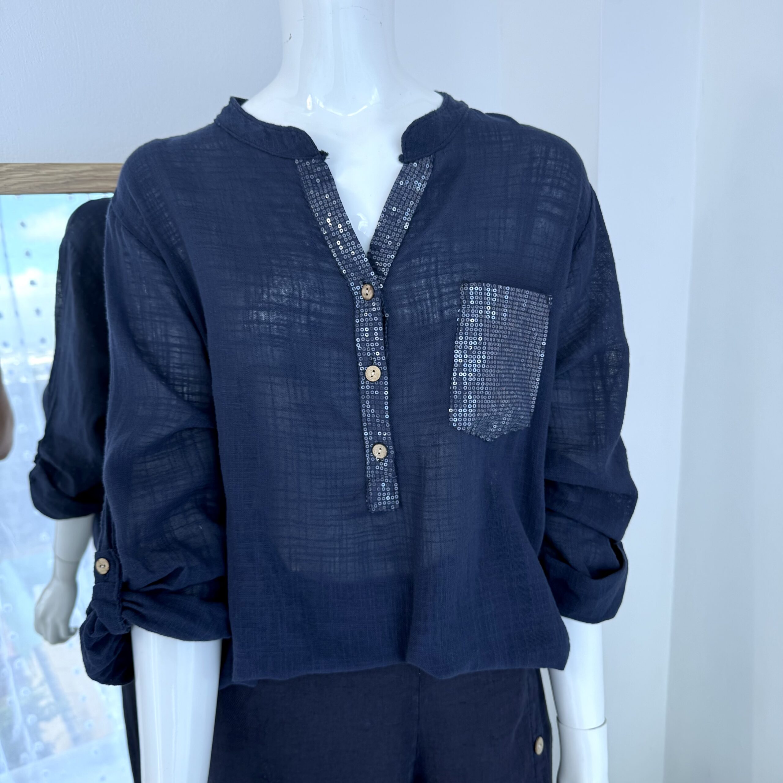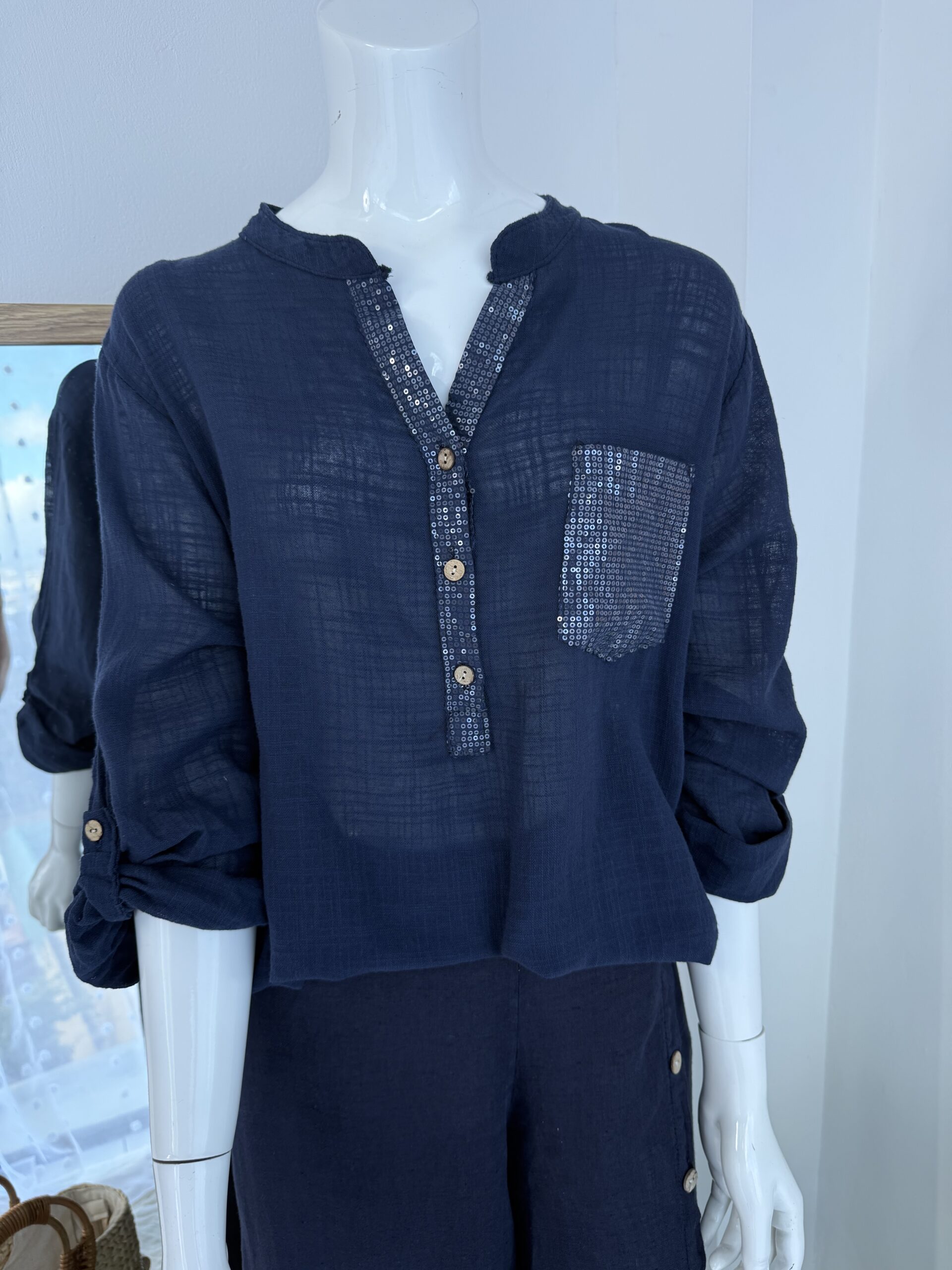 El detalle protagonista se encuentra en el borde del escote y el bolsillo frontal, ambos decorados con aplicaciones de lentejuelas pequeñas que añaden textura y un brillo discreto sin perder sobriedad.