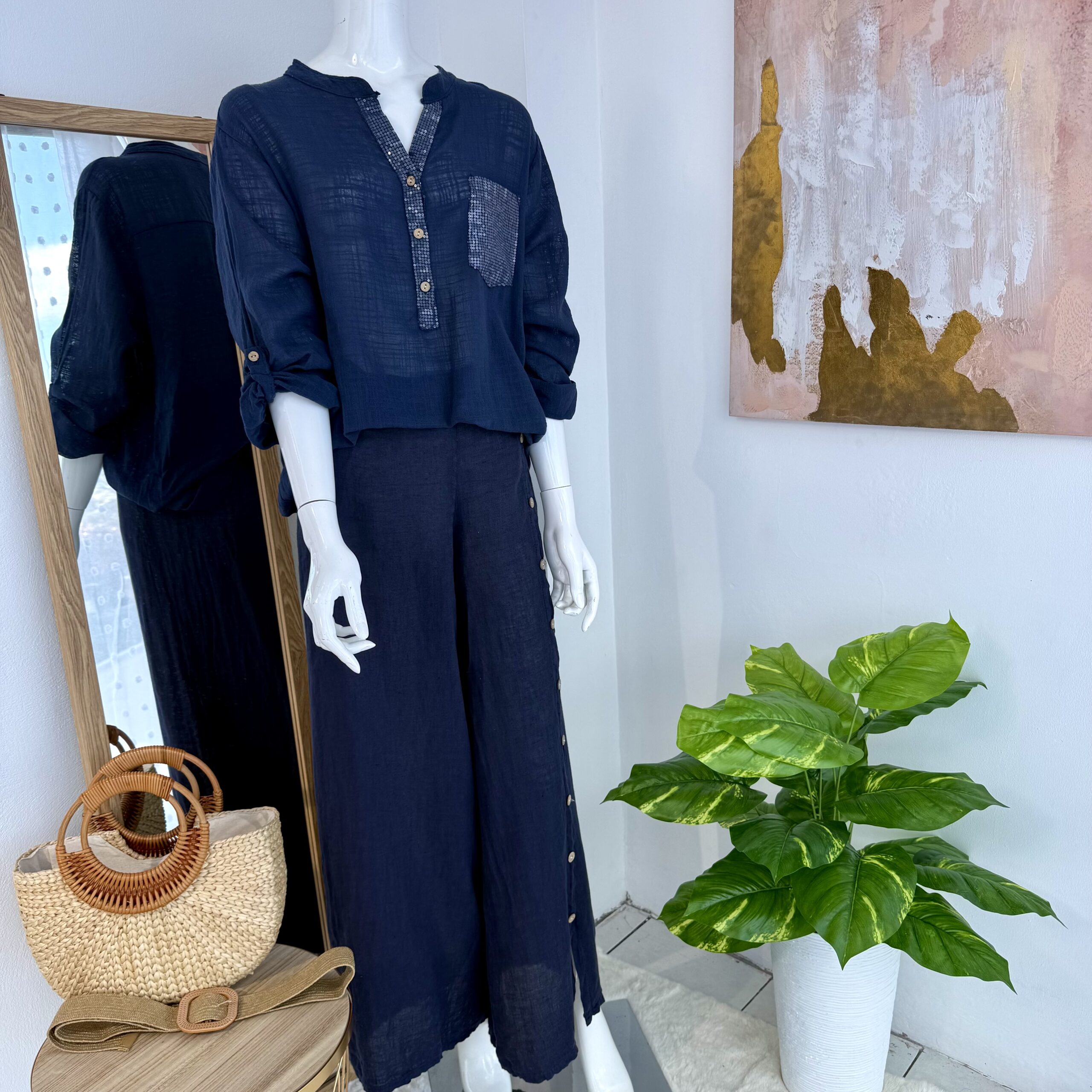 Su silueta amplia y tejido ligero permiten una caída fluida, ideal para climas cálidos o estilismos en capas. Las mangas pueden llevarse largas o ligeramente recogidas para un look más informal.