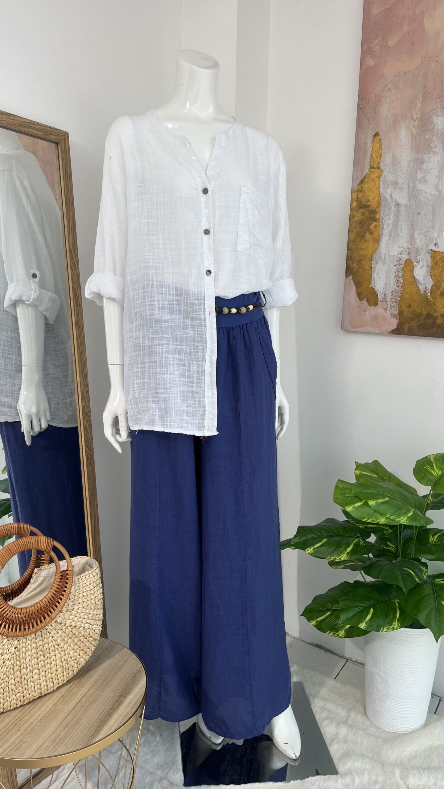 La blusa blanca presenta una silueta amplia con caída ligera y textura sutil en el tejido. Incorpora cuello abierto tipo mao con botonadura frontal visible y botones en contraste que aportan definición vertical al diseño.