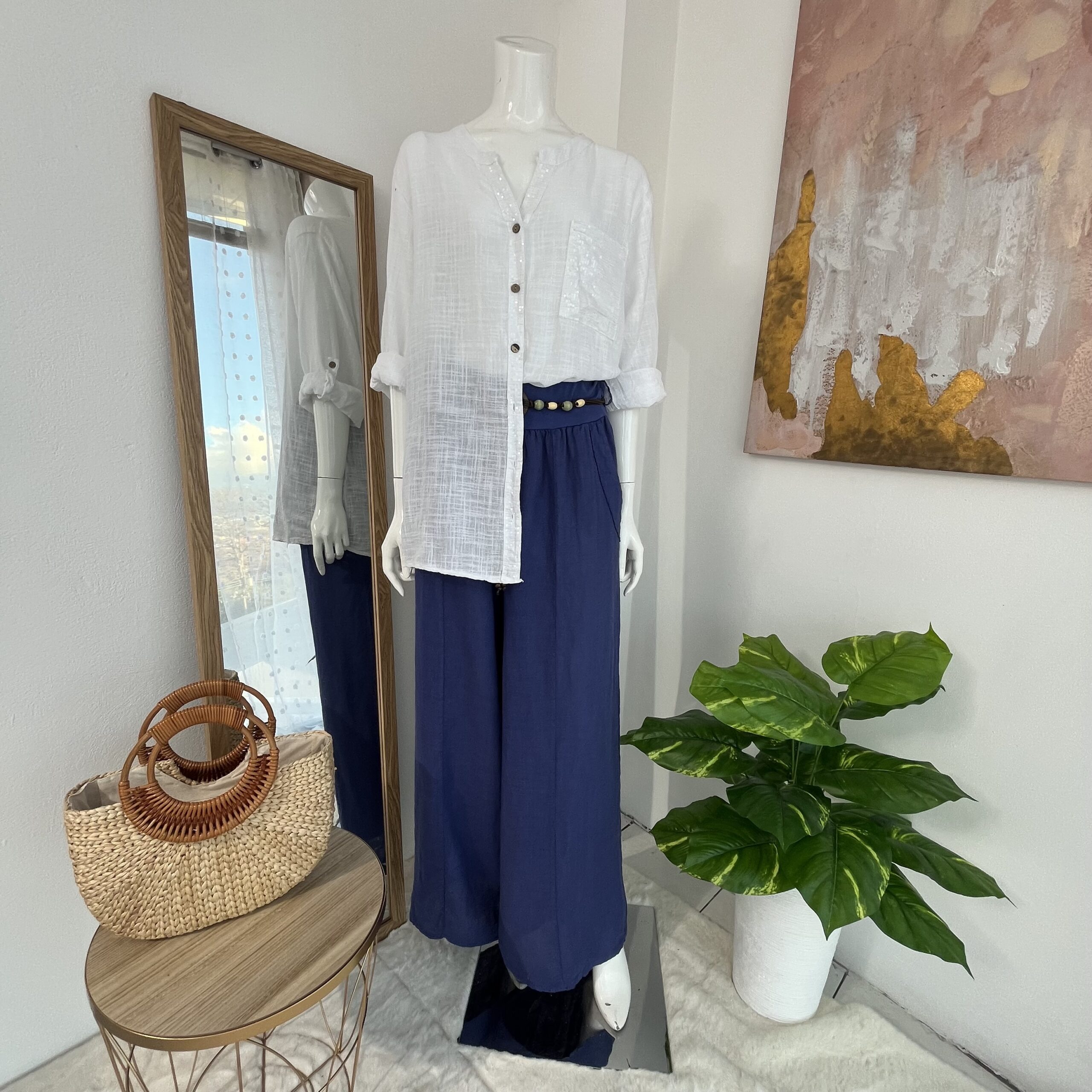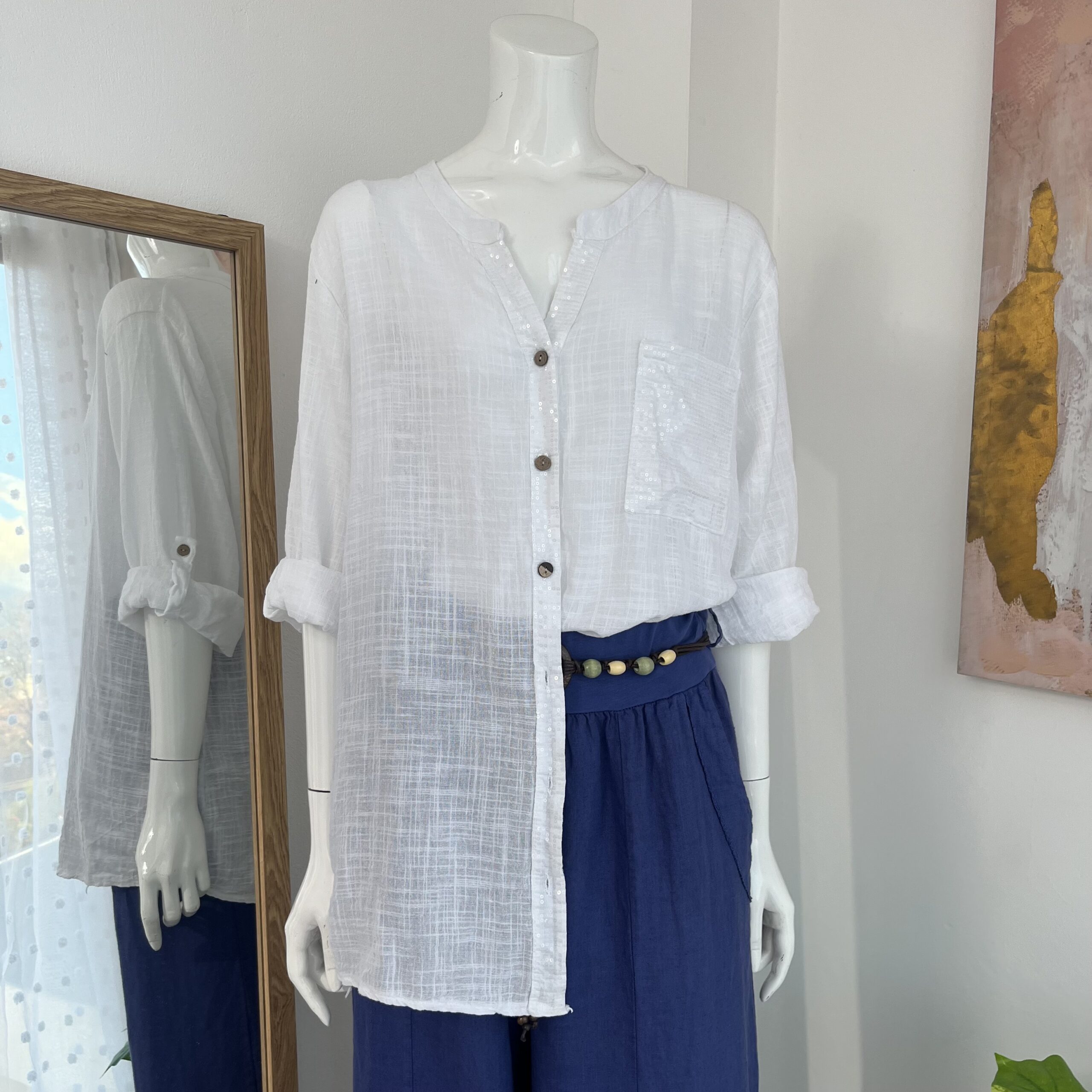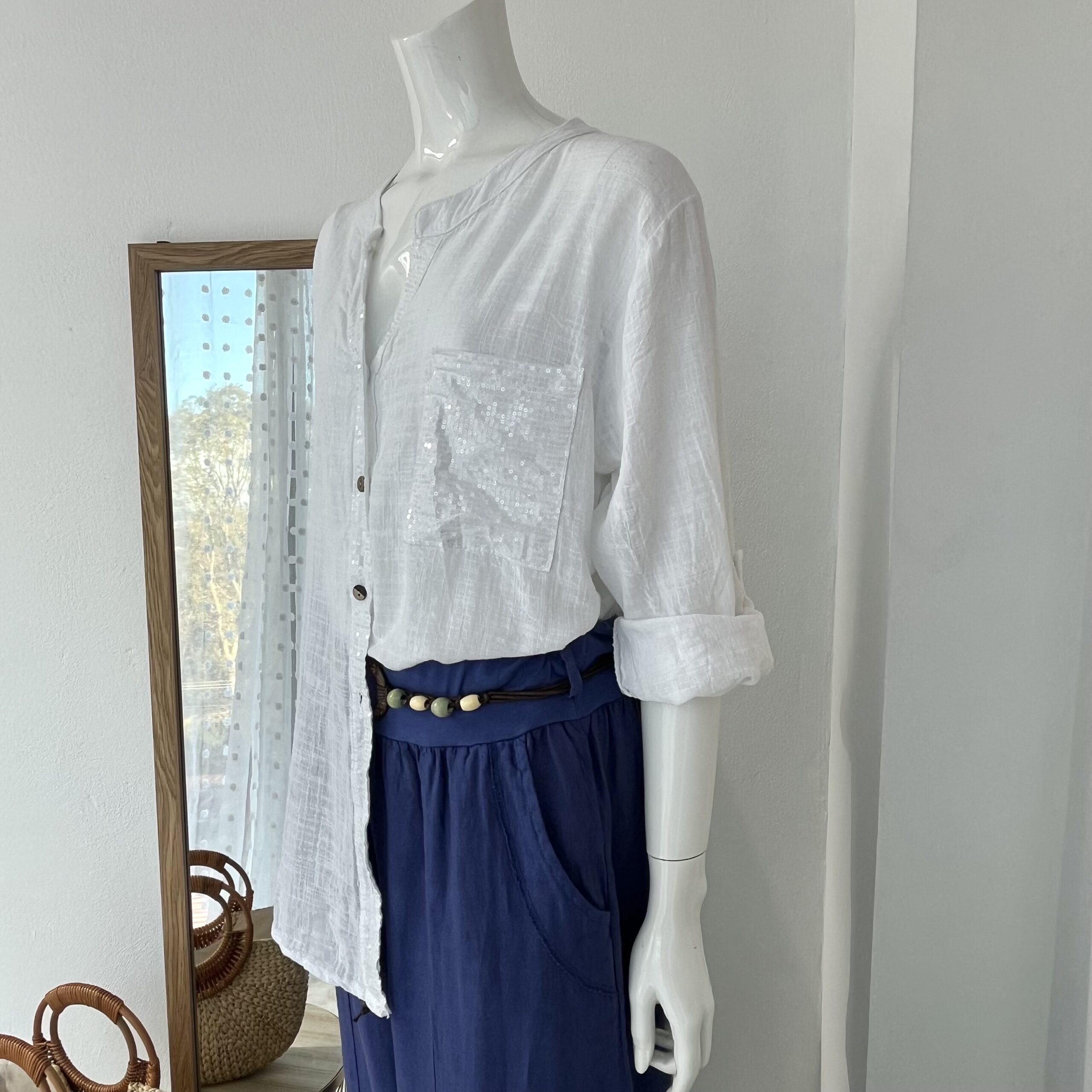 El bolsillo frontal incluye aplicación de lentejuela discreta que suma textura y punto de luz sin recargar la prenda. Las mangas pueden llevarse largas o enrolladas, permitiendo adaptar el estilo según la ocasión.