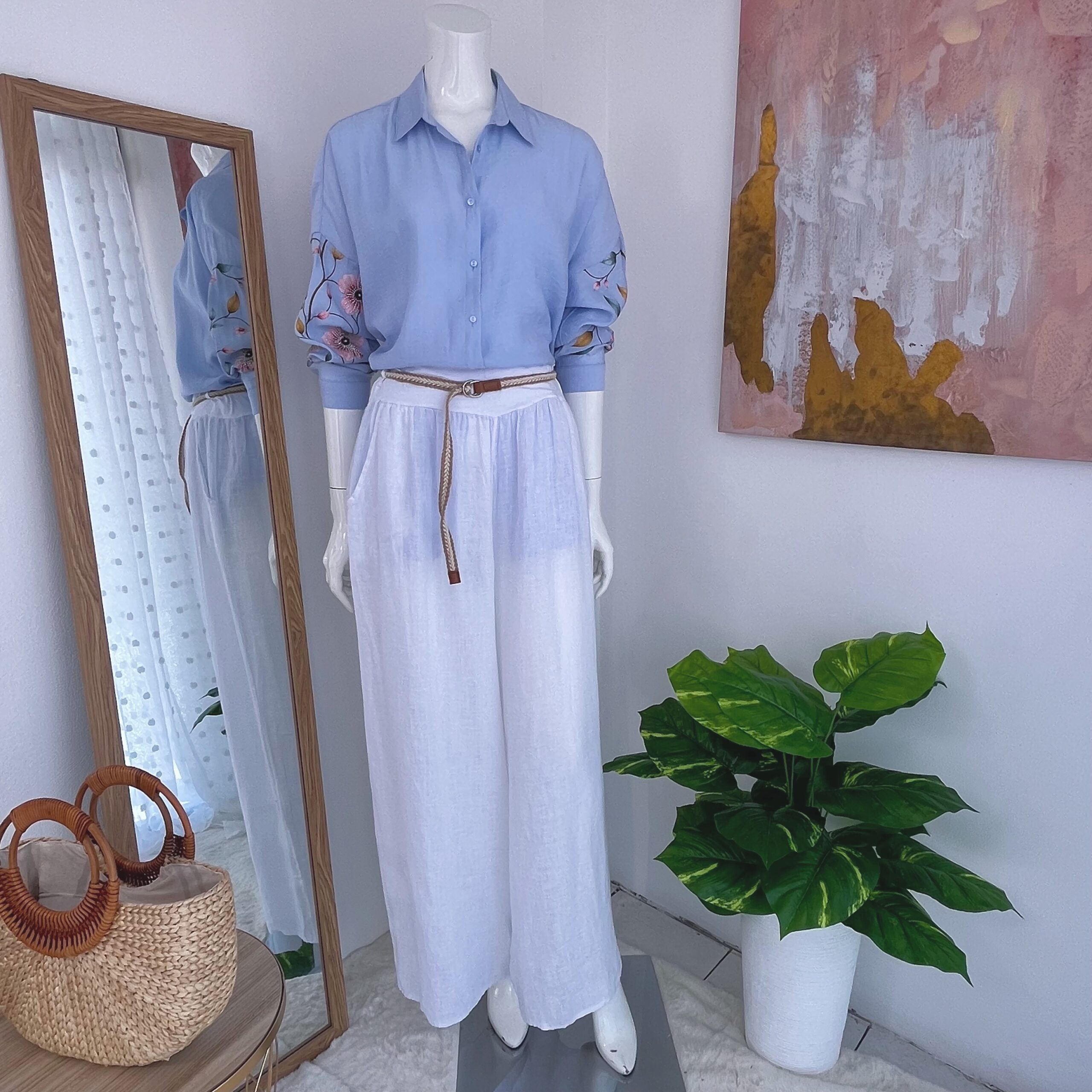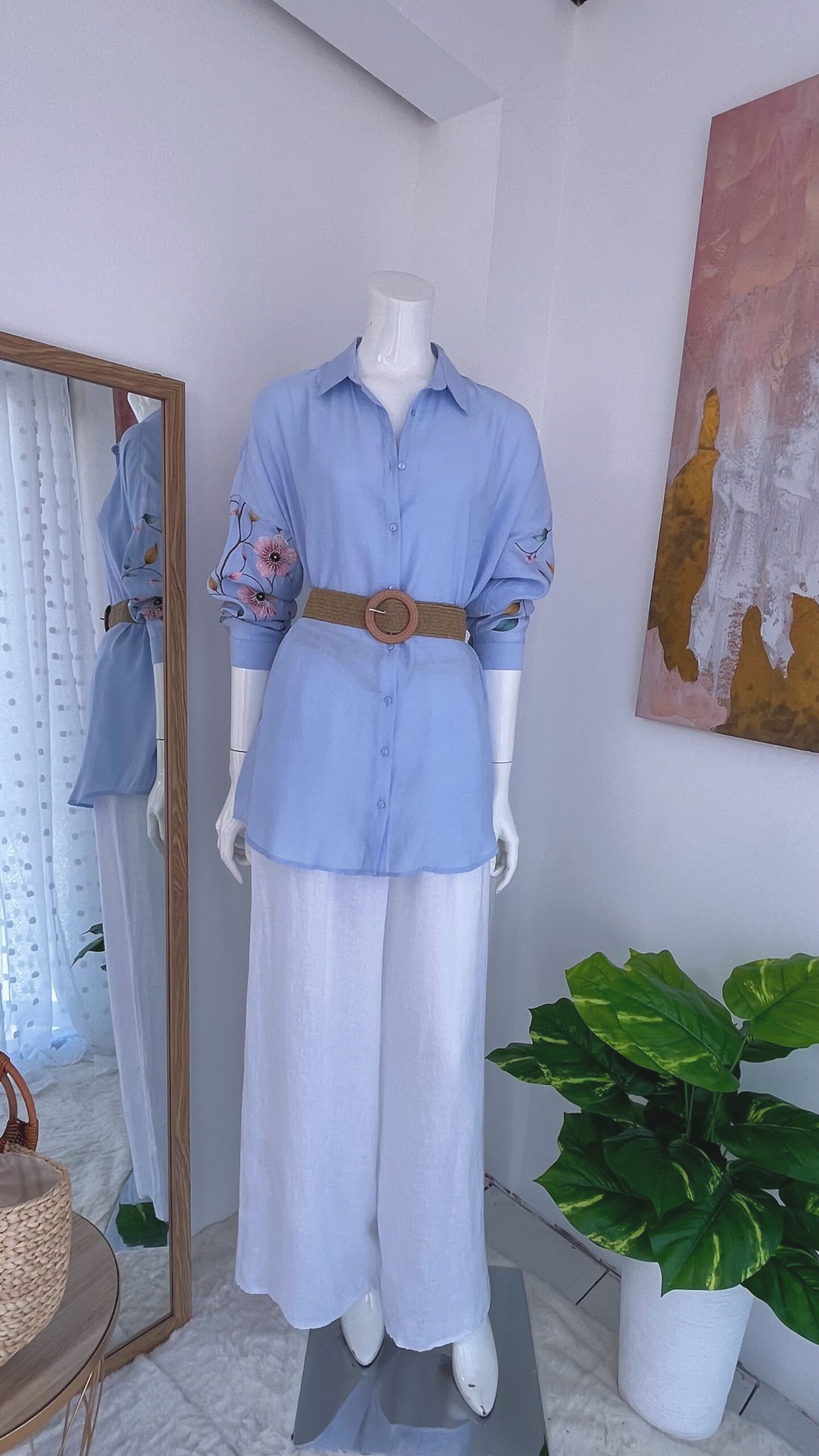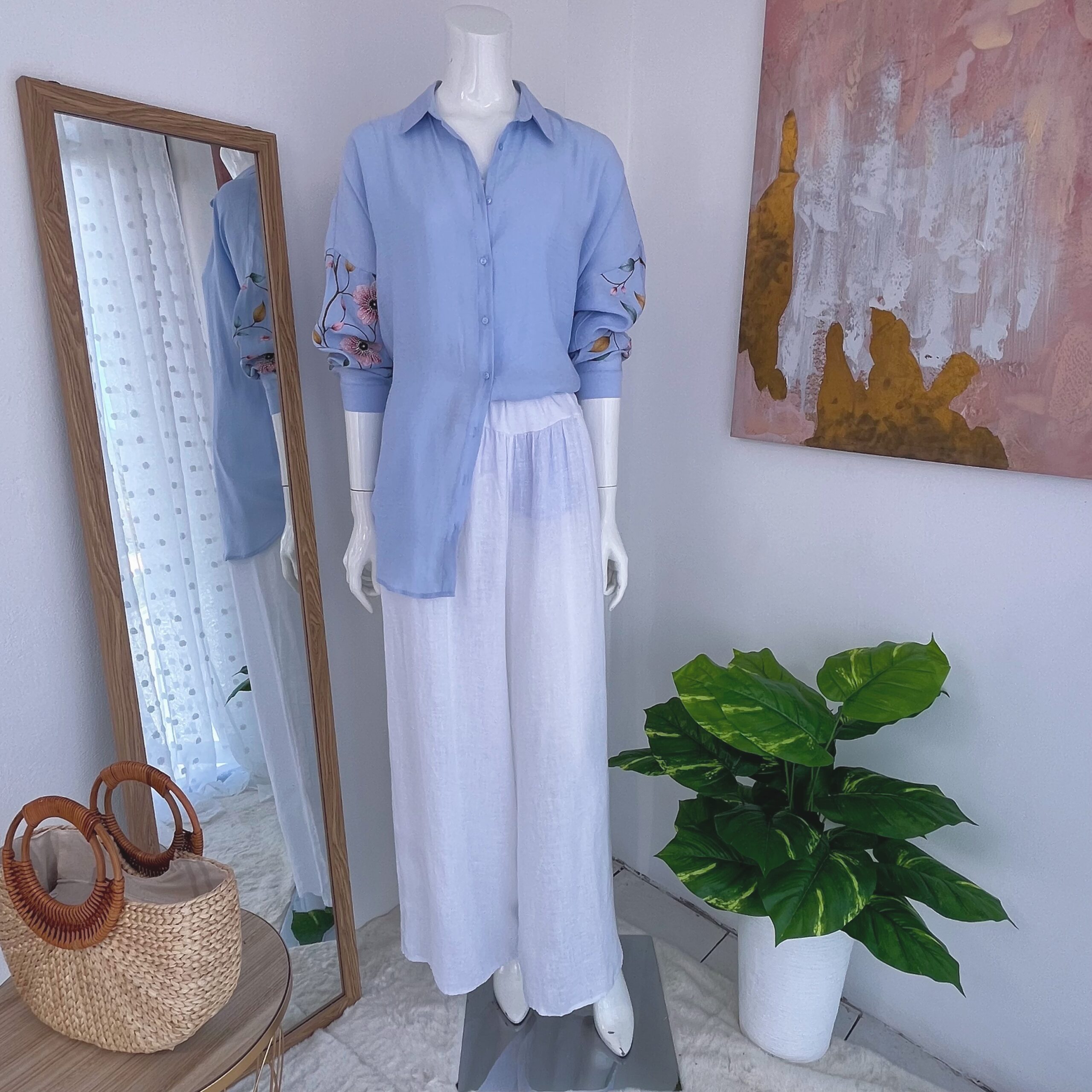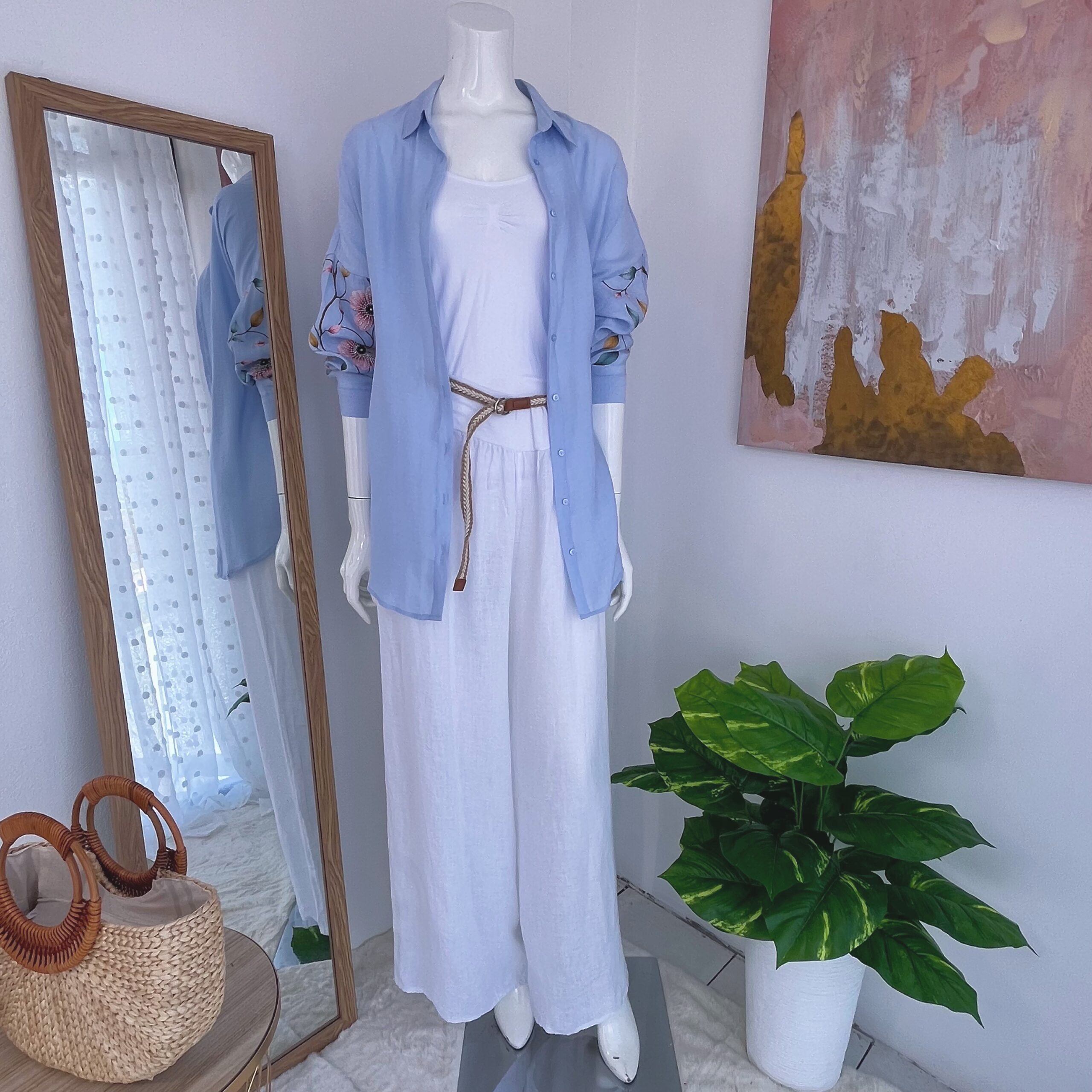 Dale un toque romántico y delicado a tu outfit con esta blusa celeste para mujer con bordado floral en mangas. Su diseño suelto y fresco es ideal para el clima cálido de Costa Rica.