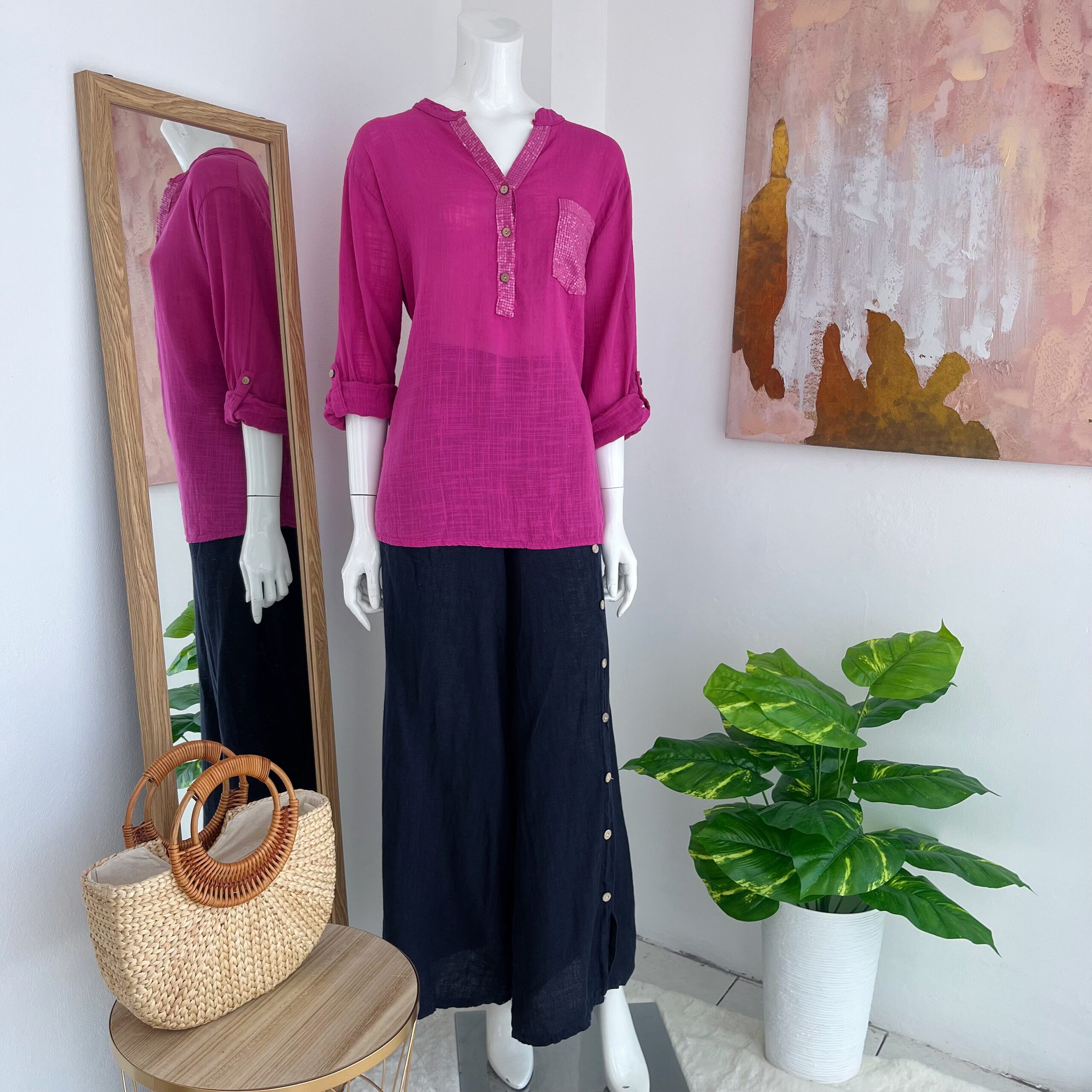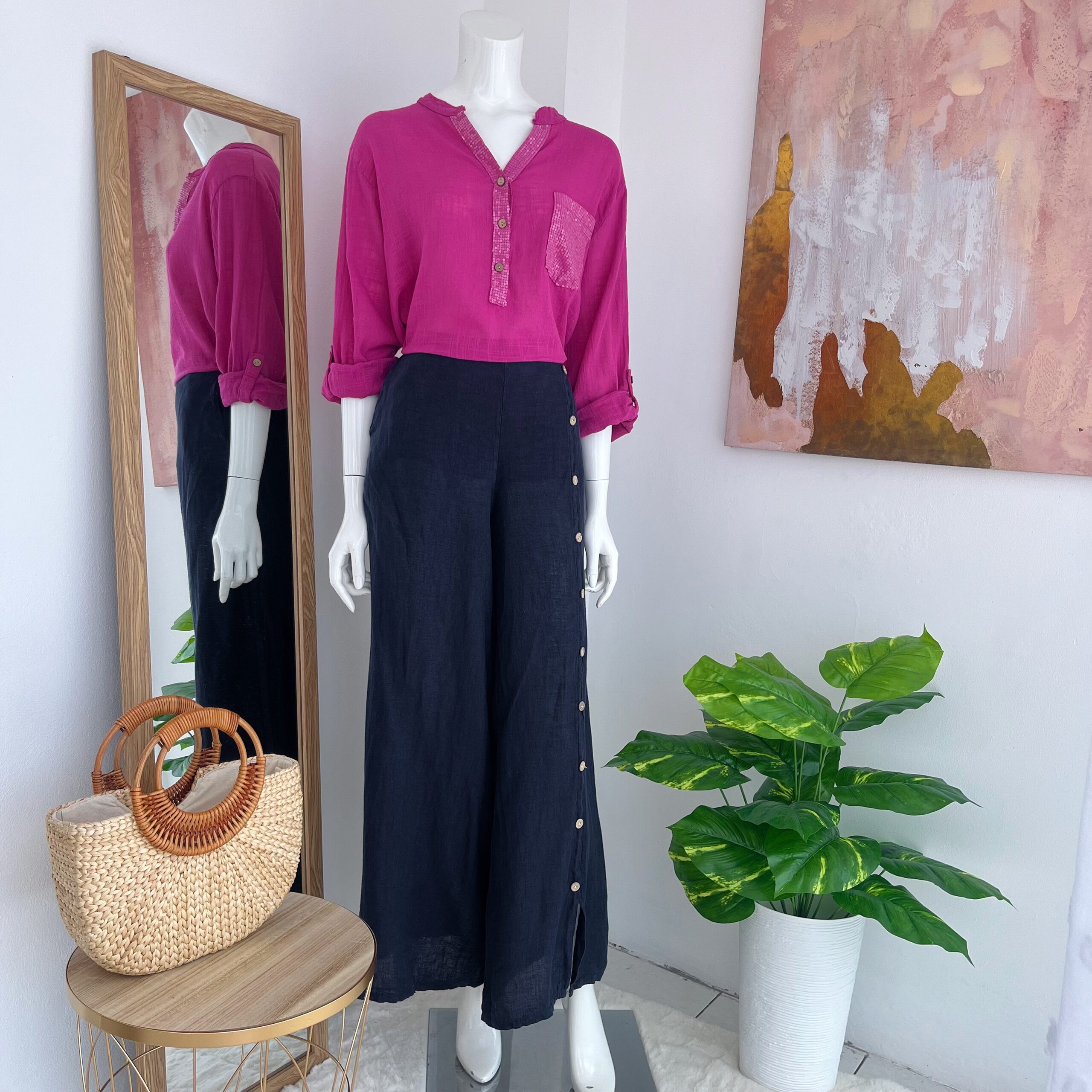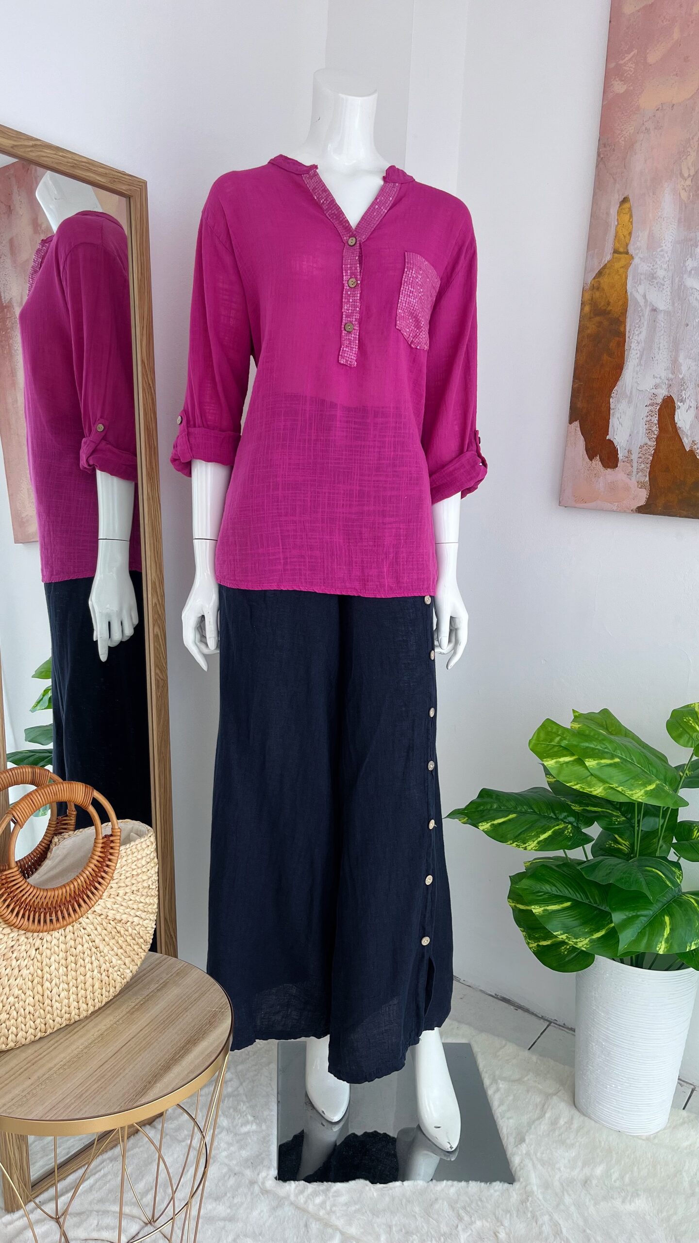 La blusa fucsia destaca por su color vibrante y femenino que aporta energía y presencia al look. El diseño incorpora una pechera vertical con lentejuelas sutiles y botones en tono natural, creando un contraste delicado y elegante.