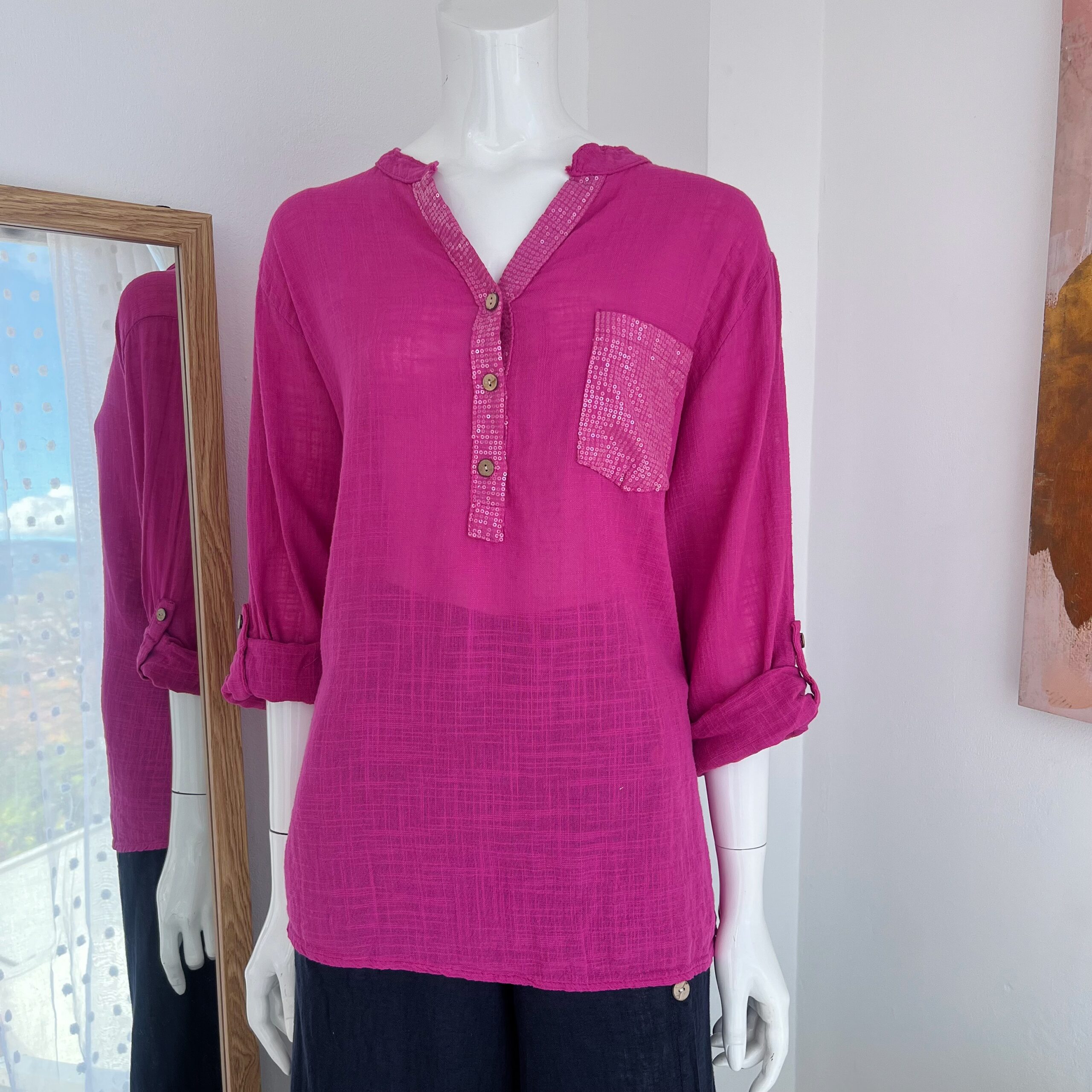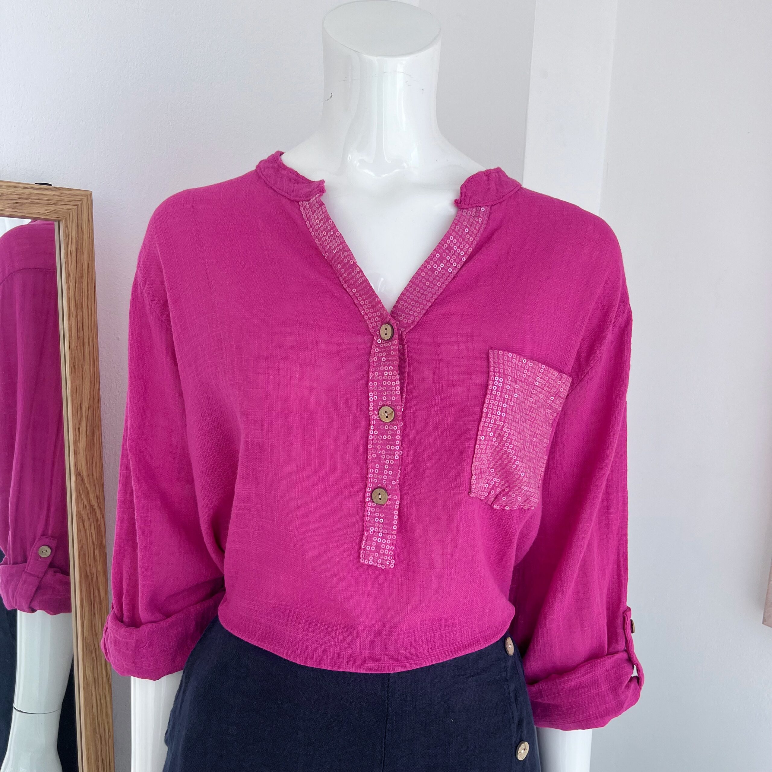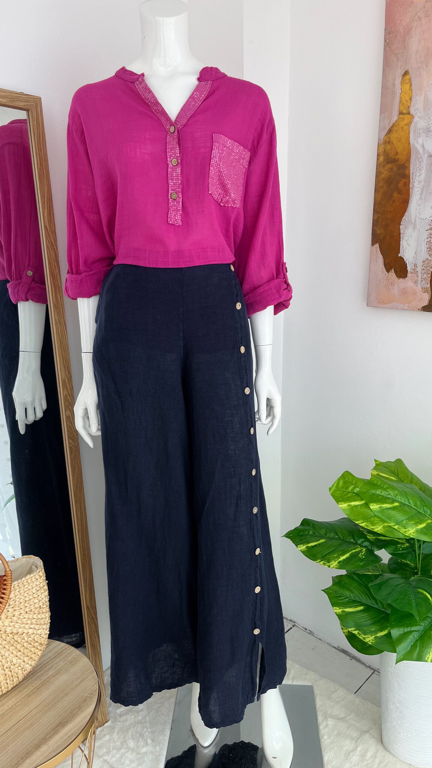 La blusa fucsia destaca por su color vibrante y femenino que aporta energía y presencia al look. El diseño incorpora una pechera vertical con lentejuelas sutiles y botones en tono natural, creando un contraste delicado y elegante.