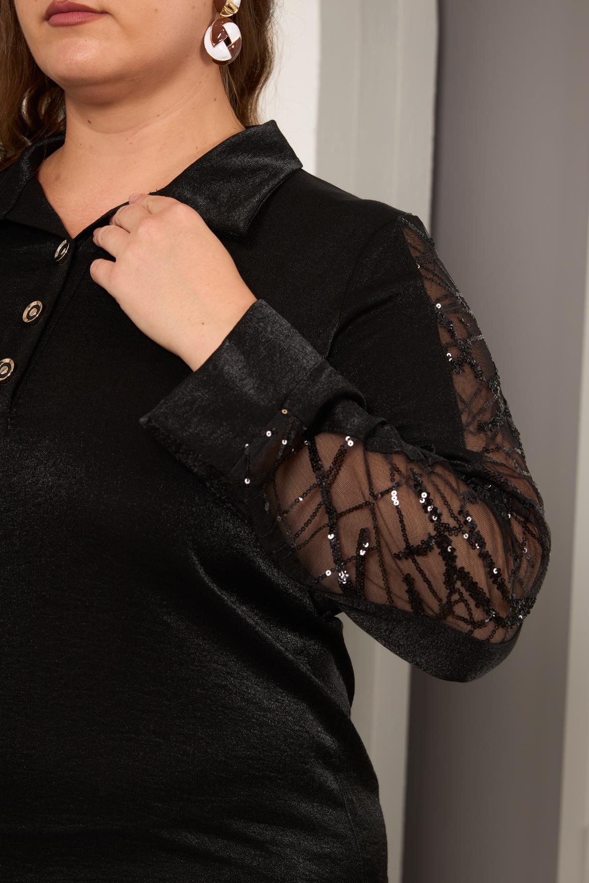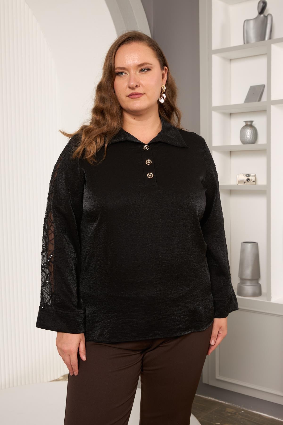 Esta blusa negra con detalles de encaje es la combinación perfecta entre sofisticación y comodidad. Su diseño de mangas largas con inserciones de encaje bordado aporta un toque femenino y moderno, mientras que los botones dorados en el pecho añaden un acento elegante y refinado.