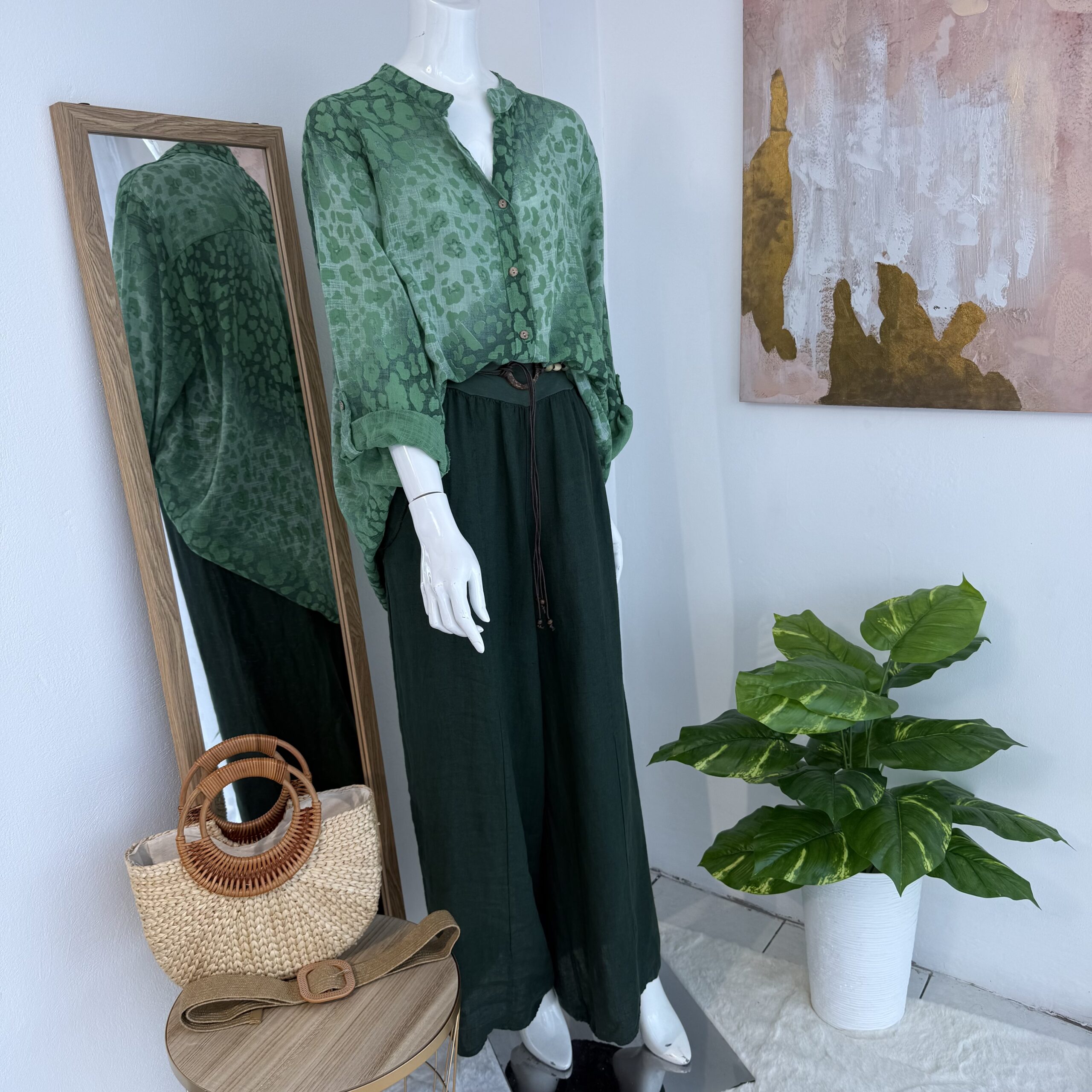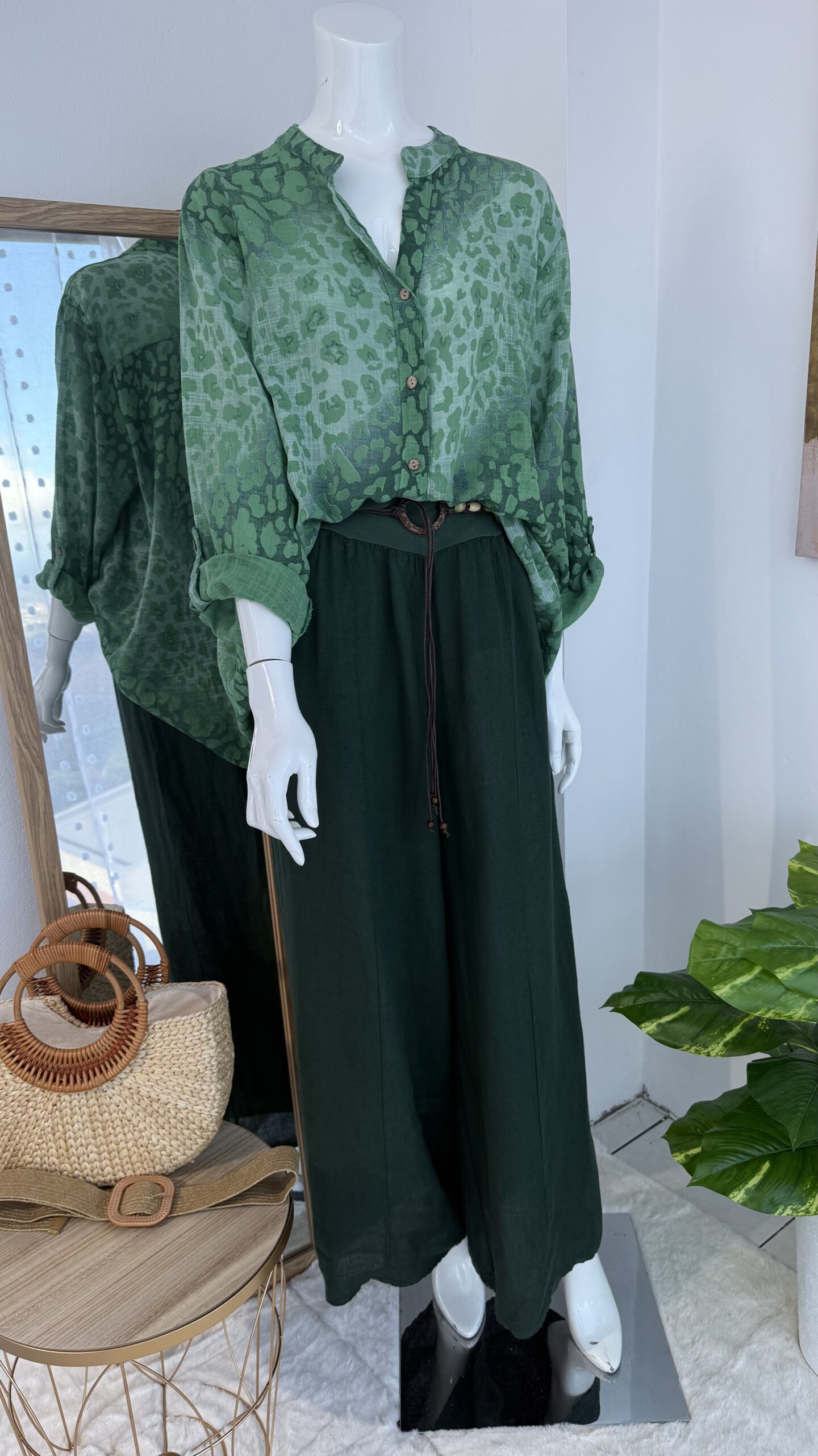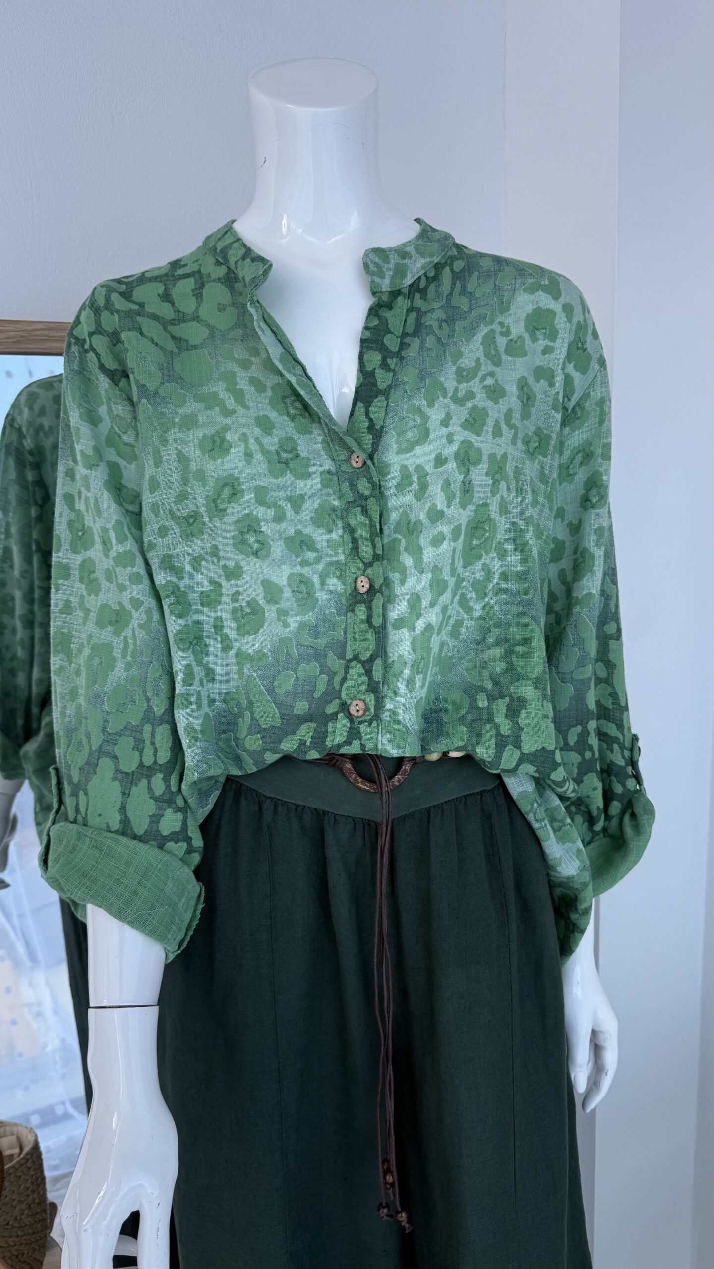 La blusa verde estampada presenta un diseño de inspiración orgánica en distintas tonalidades de verde, generando profundidad visual y un efecto natural contemporáneo.
