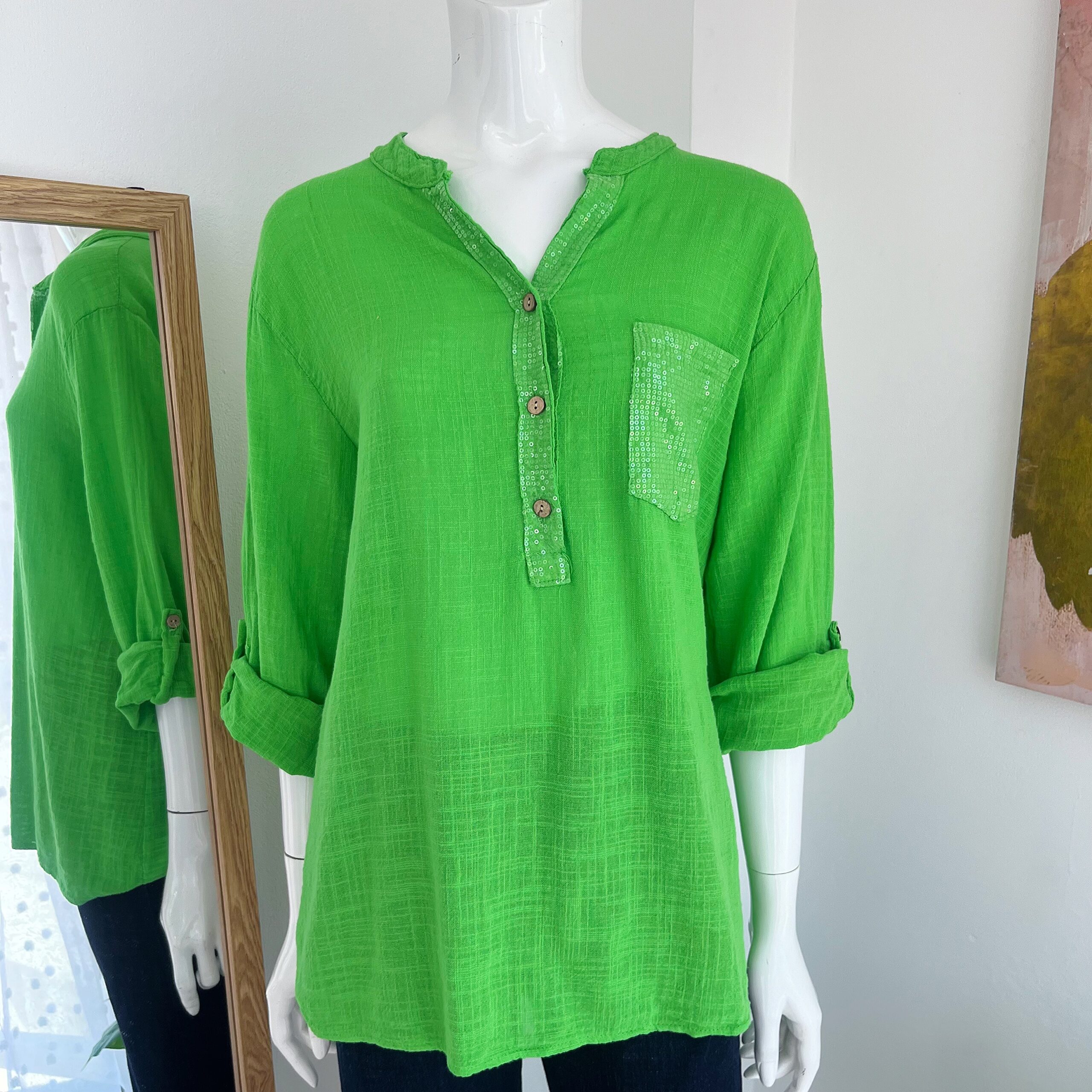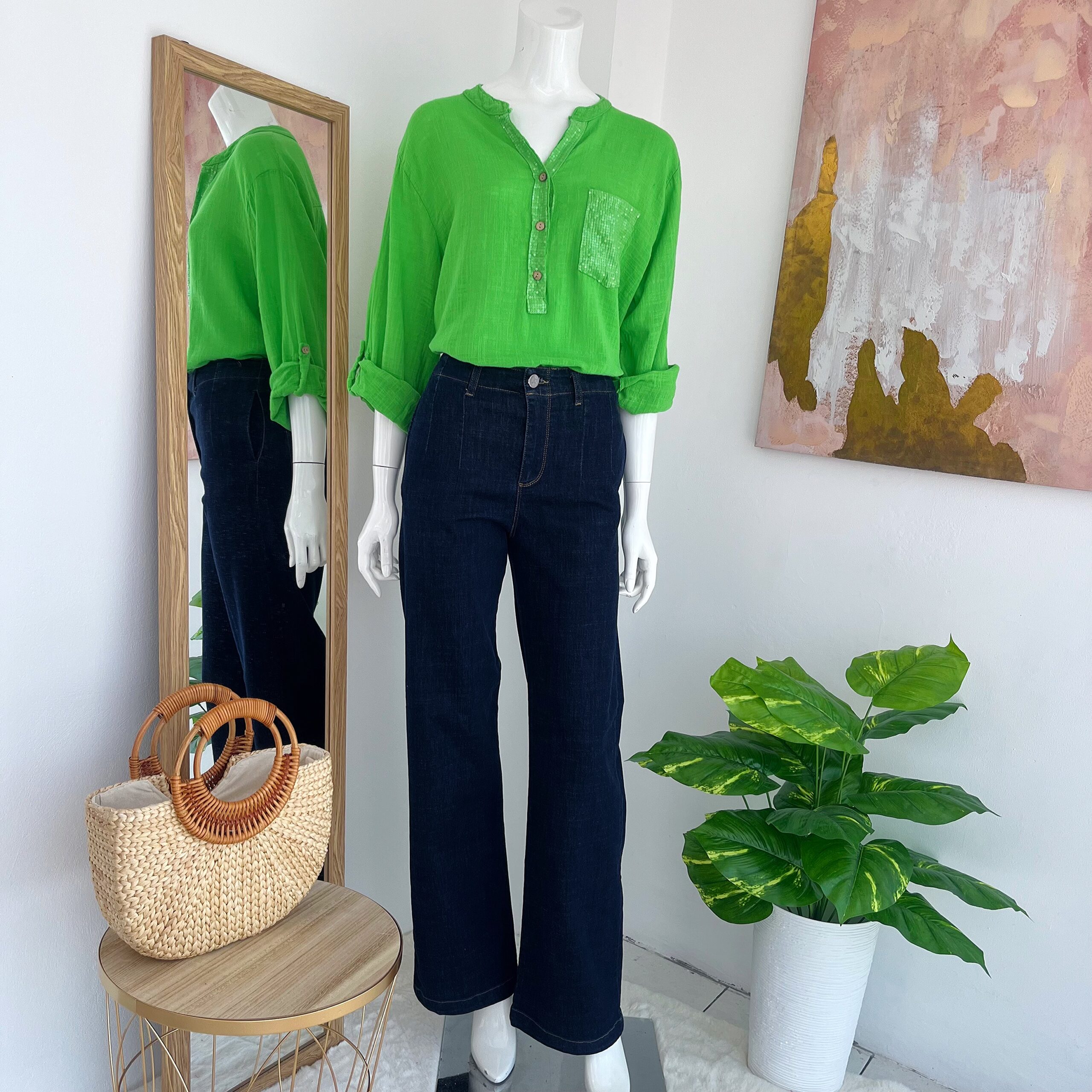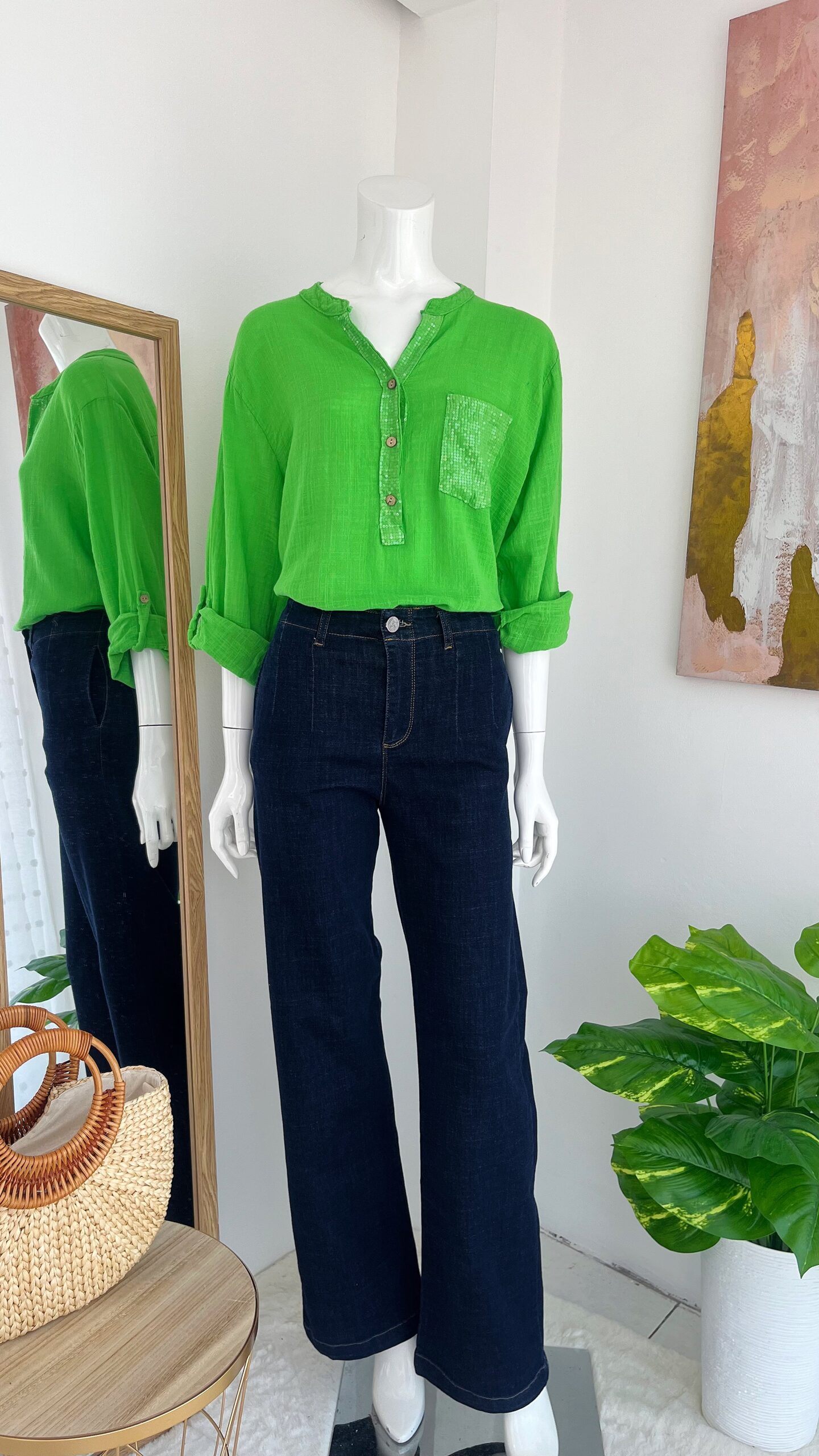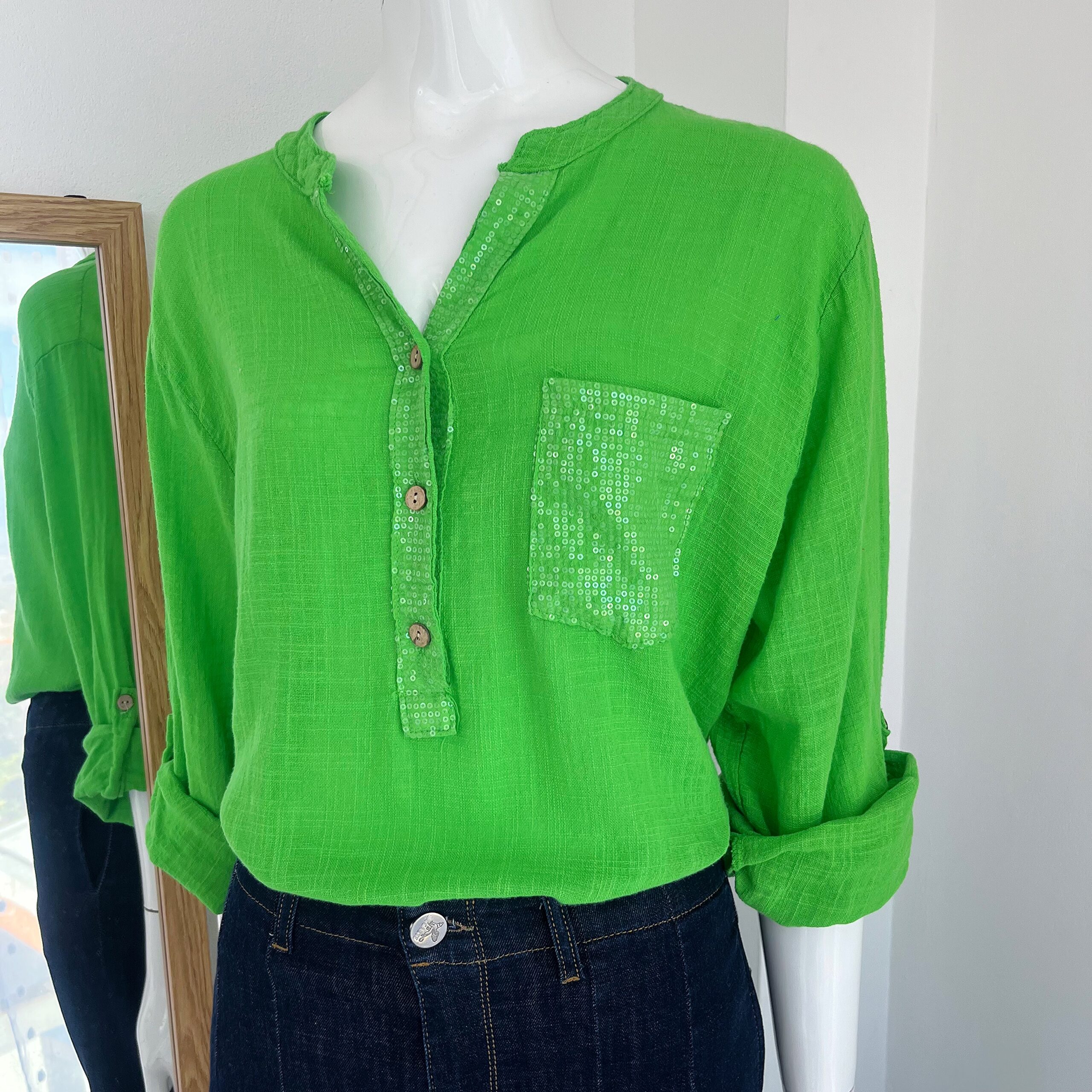 La blusa verde lima destaca por su tonalidad vibrante y luminosa que aporta frescura inmediata al look. Su diseño incorpora una pechera con lentejuelas sutiles y botones frontales en tono natural que añaden un contraste delicado y elegante.