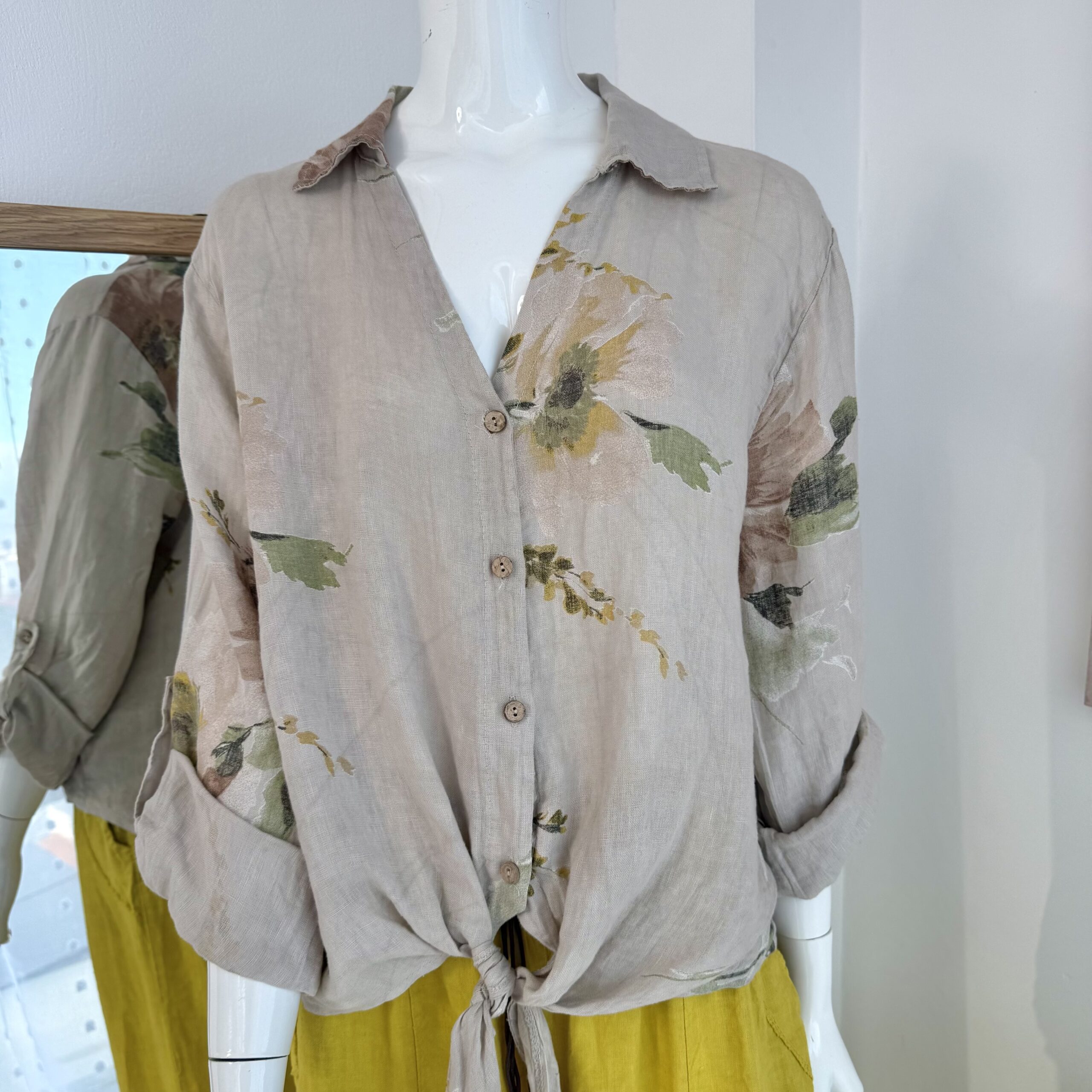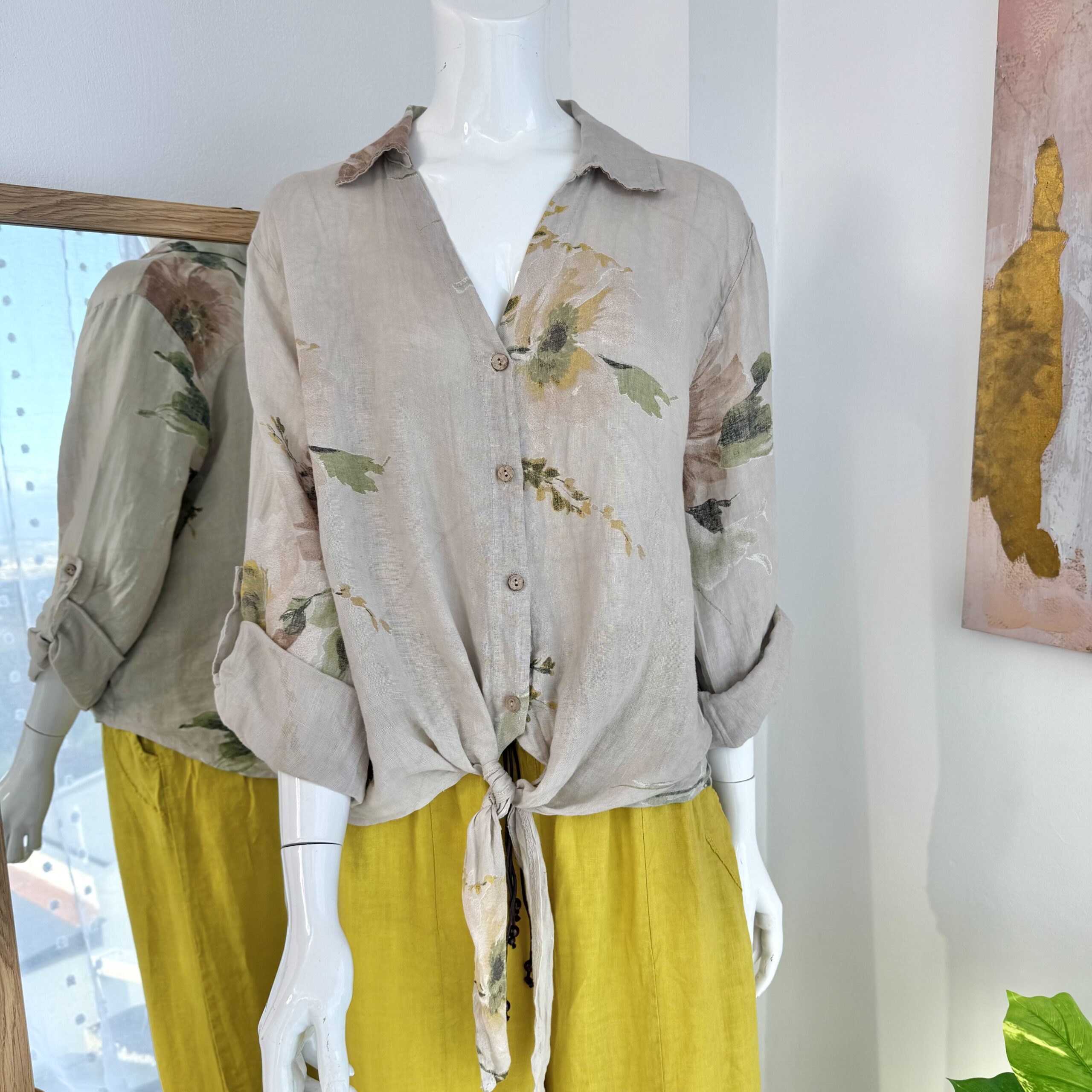 Camisera en lino italiano premium color beige con estampado floral artístico en tonos suaves. Su diseño con botones frontales y opción de anudado frontal aporta frescura y feminidad sofisticada.