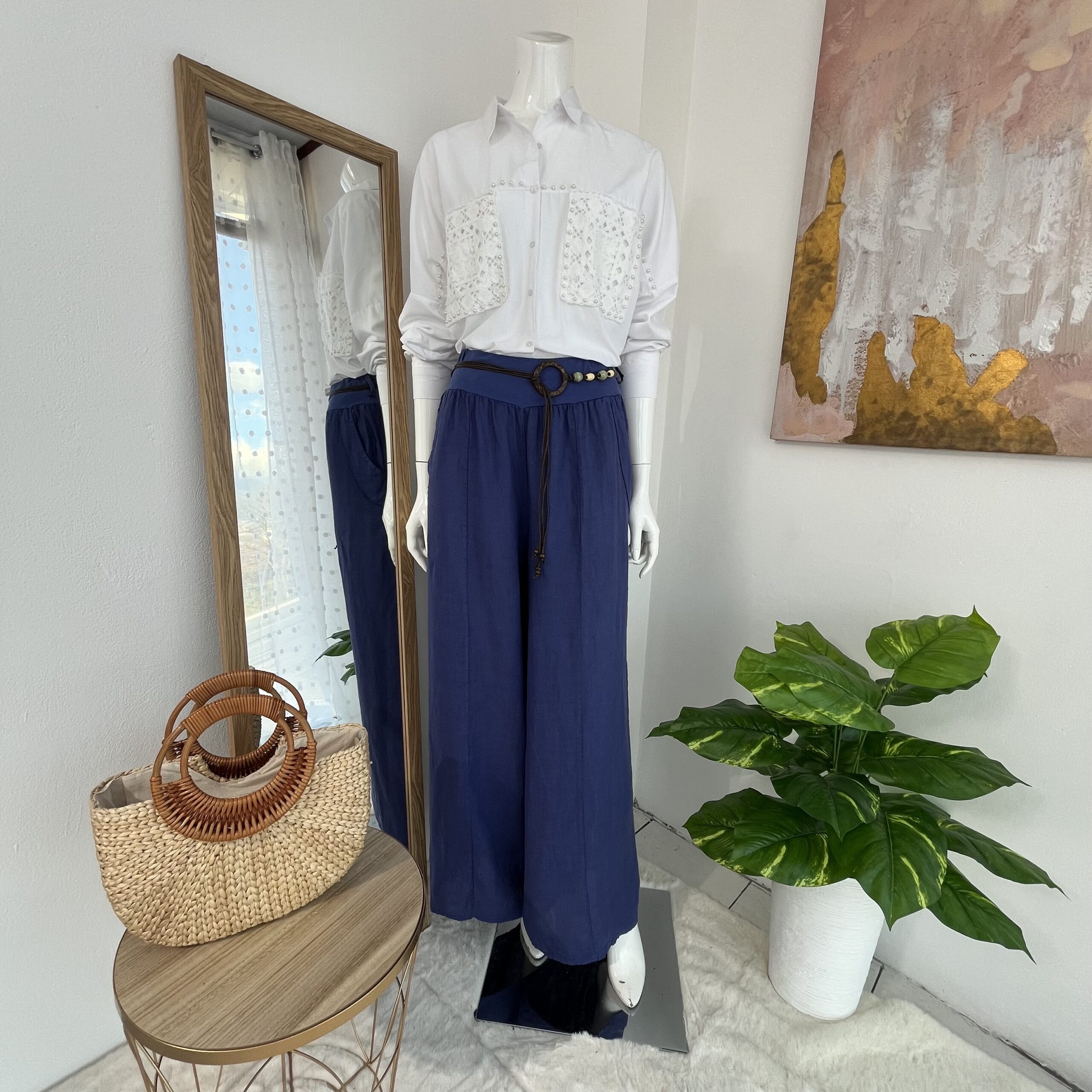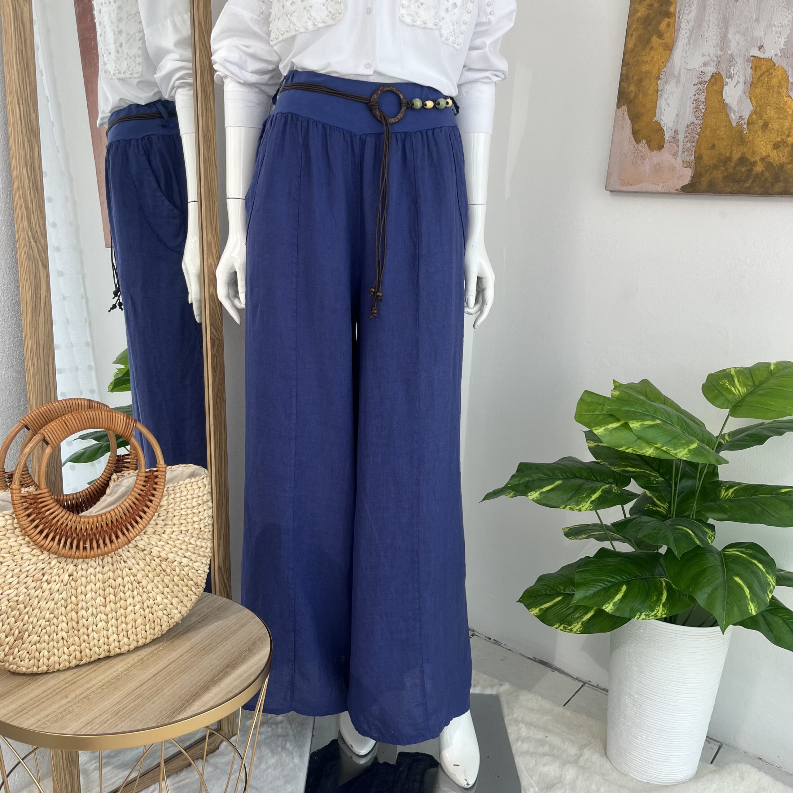 Palazzo en lino italiano premium color azul profundo, de silueta amplia y caída elegante que estiliza la figura. Incorpora cinturón decorativo que realza la cintura con un toque sofisticado.