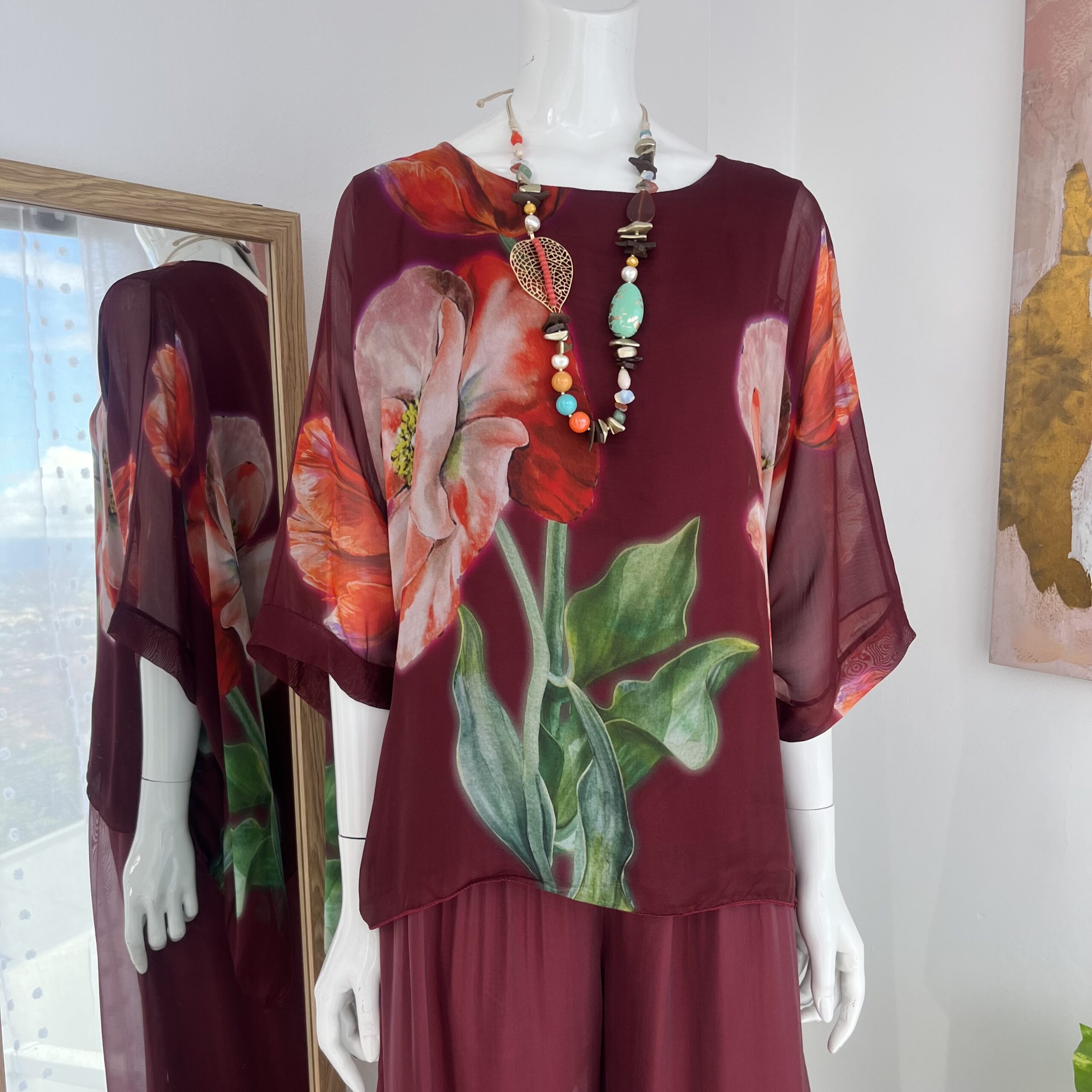 La blusa amplia con caída suave combina armoniosamente con el pantalón palazzo, creando un efecto estilizado y elegante. El estampado floral en tonos cálidos añade profundidad y exclusividad.